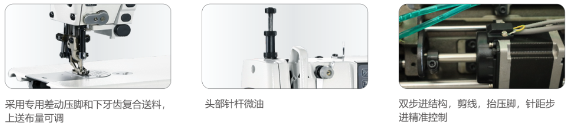采用内置双步进结构,剪线,抬压脚,针距步进精准控制。加长大空间操作平台,密封油盘;上差调节显示屏直接控制调整,便于操作和多功能场景切换使用。具有上差动送布功能,应对各种组合面料的缝纫,不易起皱。通过顺滑的上送布轨迹实现优美,稳定的缝制品质,对错层有明显改善。